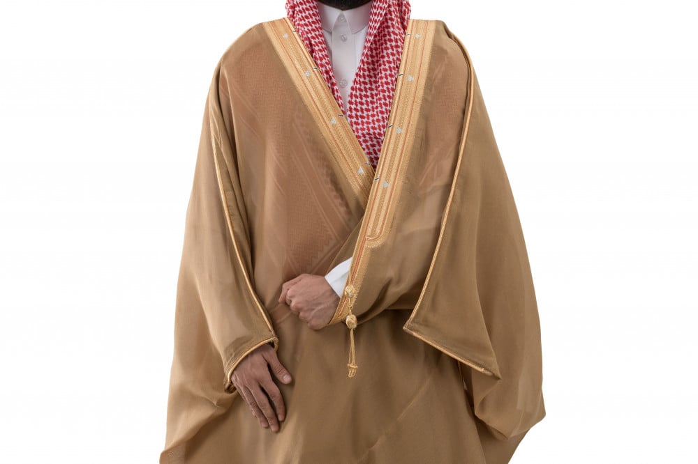 • إضافة الاسم: بشت زعفراني فاتح بإمكانية حفر اسمك مجانًا لمزيد من التميز.