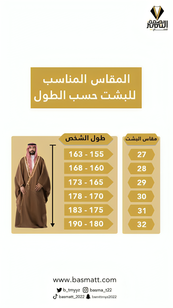 - استخدم دليل كيفية قياس البشت والخبانة لمعرفة الطول المناسب حسب طولك وثوبك.