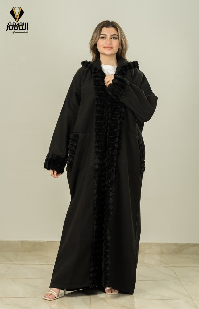 فروة نسائي اسود قماش كشميري جوخ مطعم بفرو