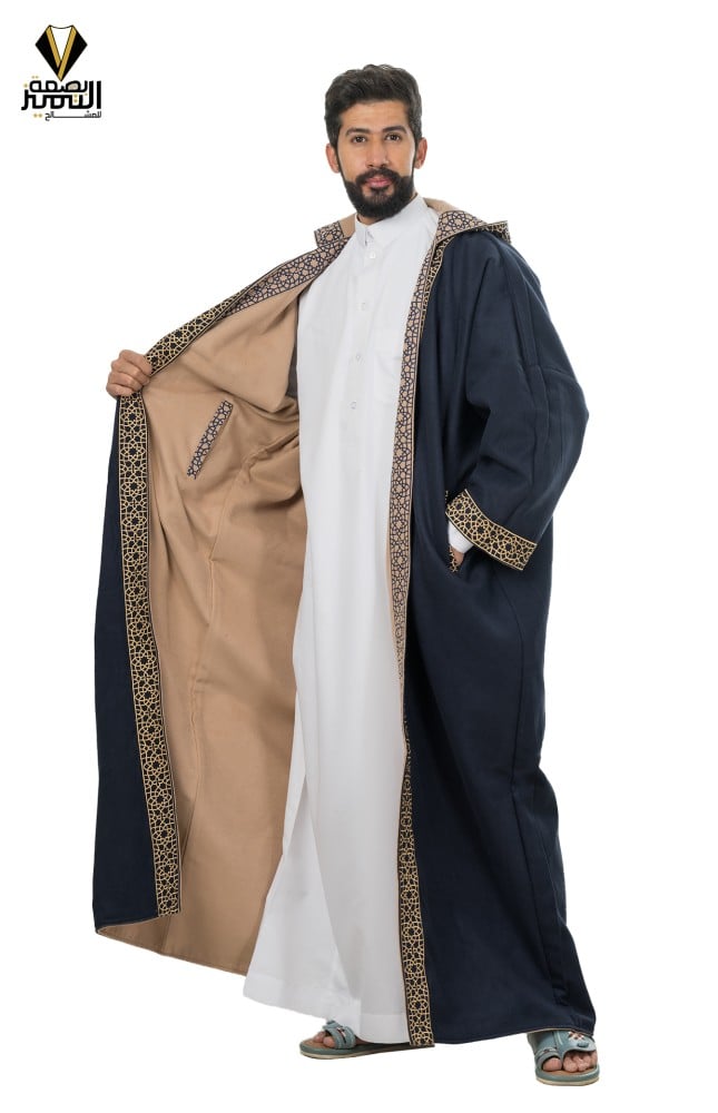 بحيث تنلبس على الوجهين بالإضافة إلى جيوب جانبية وقبعة الرأس بتطريز إسلامي حديث .