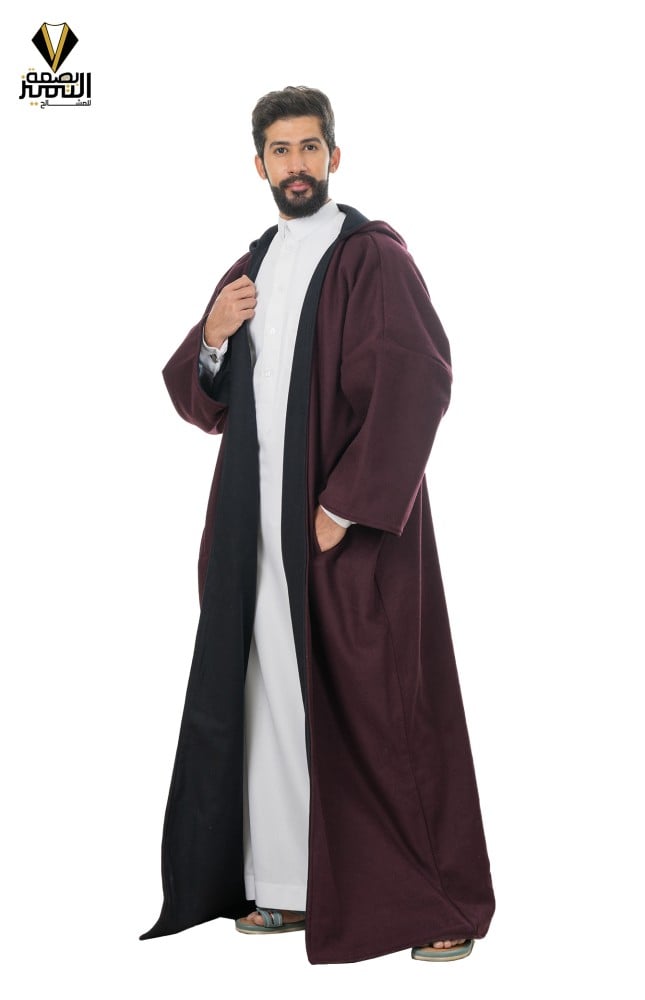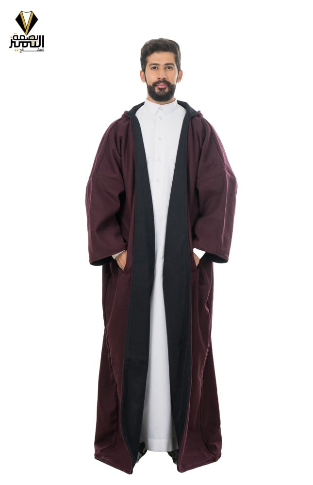 قماش كشميري صوف دافىء جداً ذو إطلالة مميزة في اللبس بحيث تنلبس على الوجهين بالإضافة إلى جيوب جانبية وقبعة الرأس .