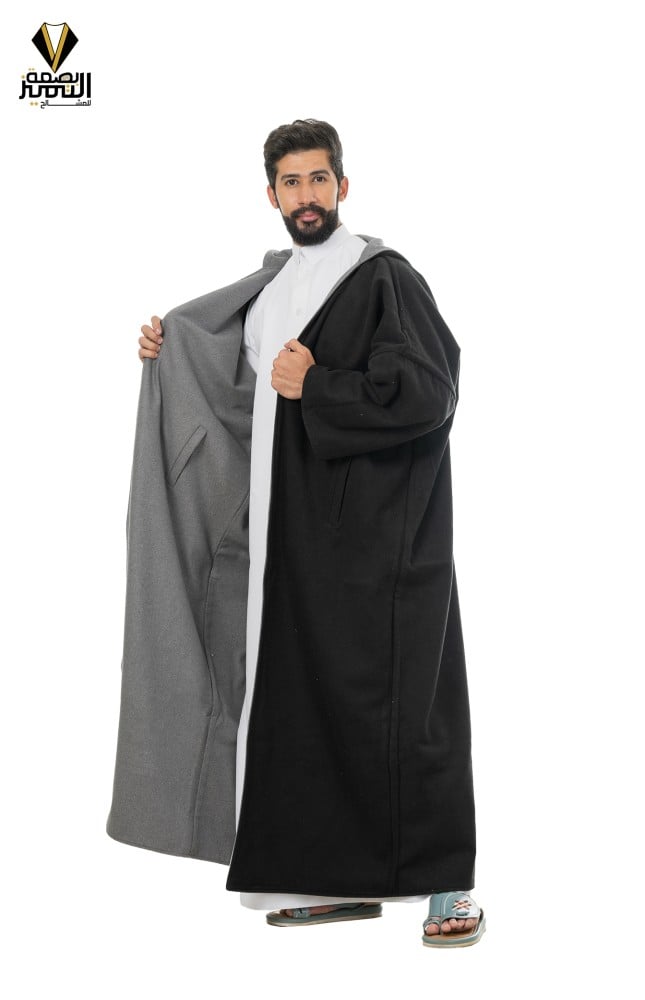 قماش كشميري صوف دافىء جداً ذو إطلالة مميزة في اللبس بحيث تنلبس على الوجهين بالإضافة إلى جيوب جانبية وقبعة الرأس .